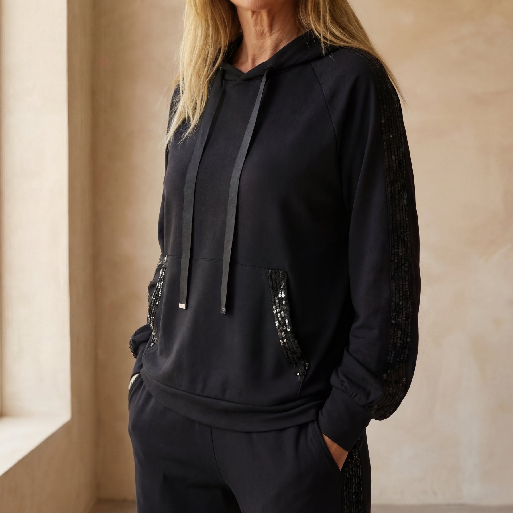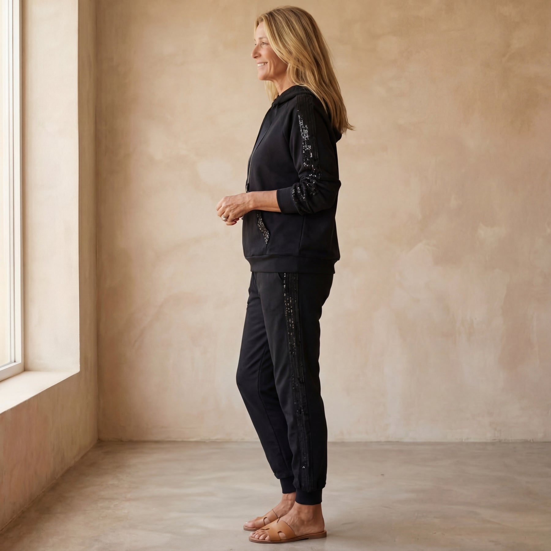 The Lorina Comfy 2 Piece Set features a relaxed hooded top with embellished sleeve detailing, paired with matching tapered joggers for a coordinated look. Designed for comfort without sacrificing style, it offers a smooth drape, practical pockets, and an easy fit for everyday wear.