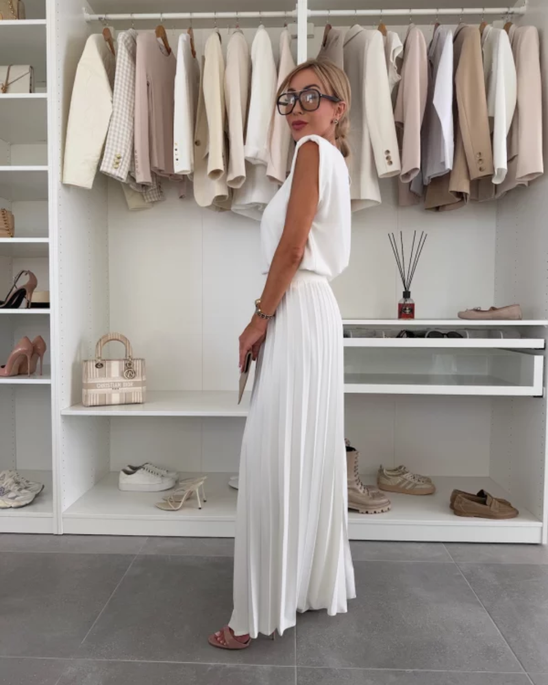 This eye-catching two-piece set blends with elegant tailoring for a look that radiates confidence. Designed for effortless impact, the flowing wide-leg trousers and sleeveless top make a chic duo for both day and evening occasions. Comfortable, breezy, and striking—style made easy.