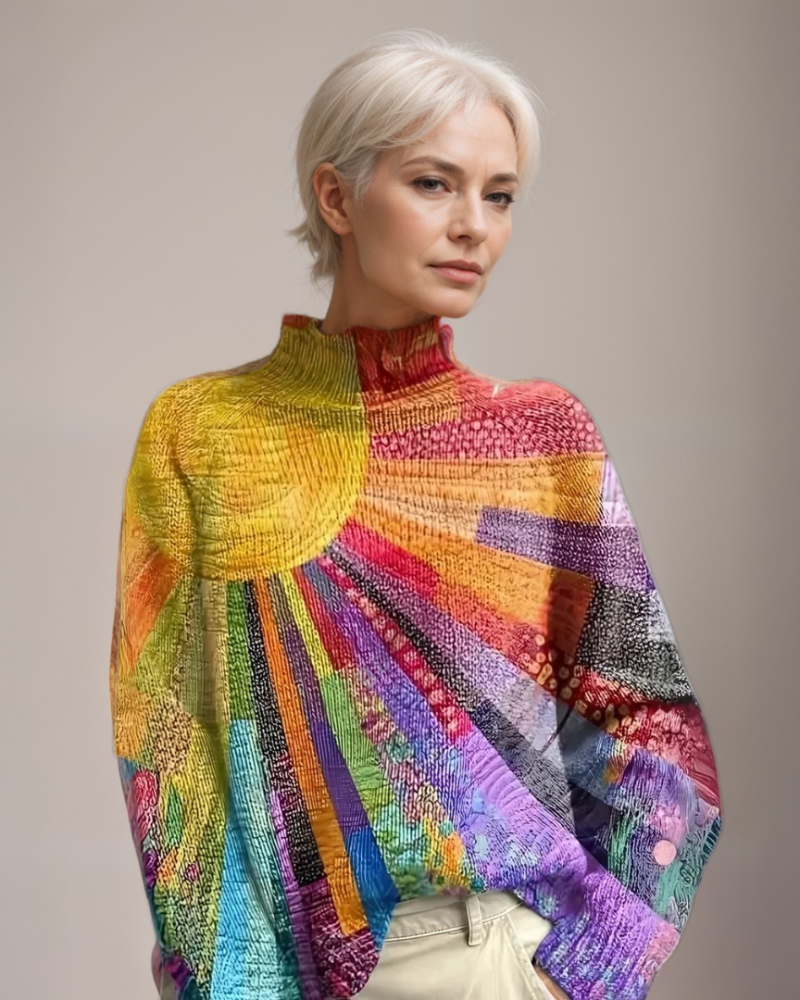 With a radiant mix of artistic patterns and a soft, cozy feel, this sweater combines style and comfort seamlessly.